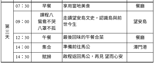 營隊結束當天將乘坐公營客輪南海之星返回馬公,費用已包含在團費裡,自望安開航時間約14:30,約15:30可抵達馬公,故請訂16:30後離開馬公之班機或船班較為保險。